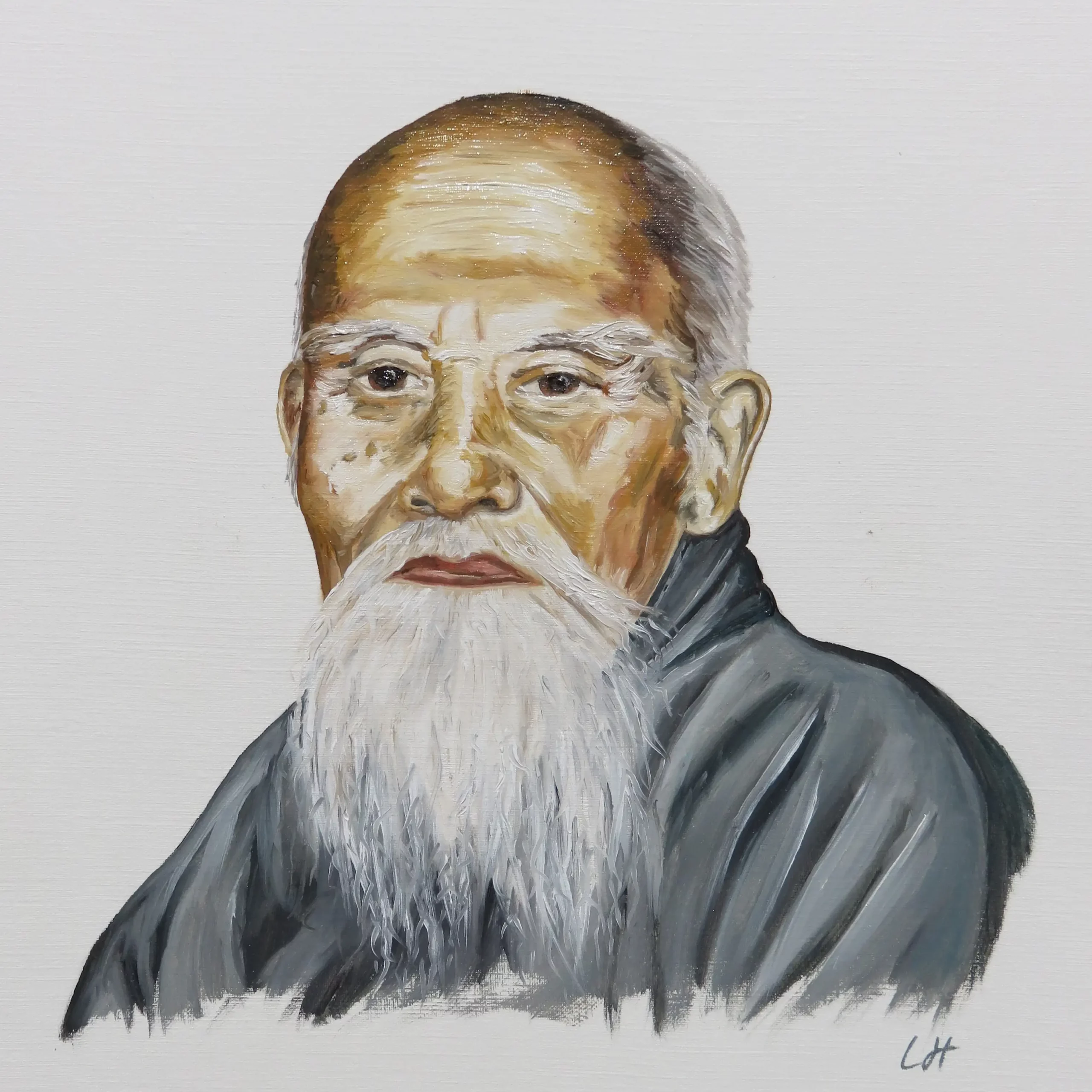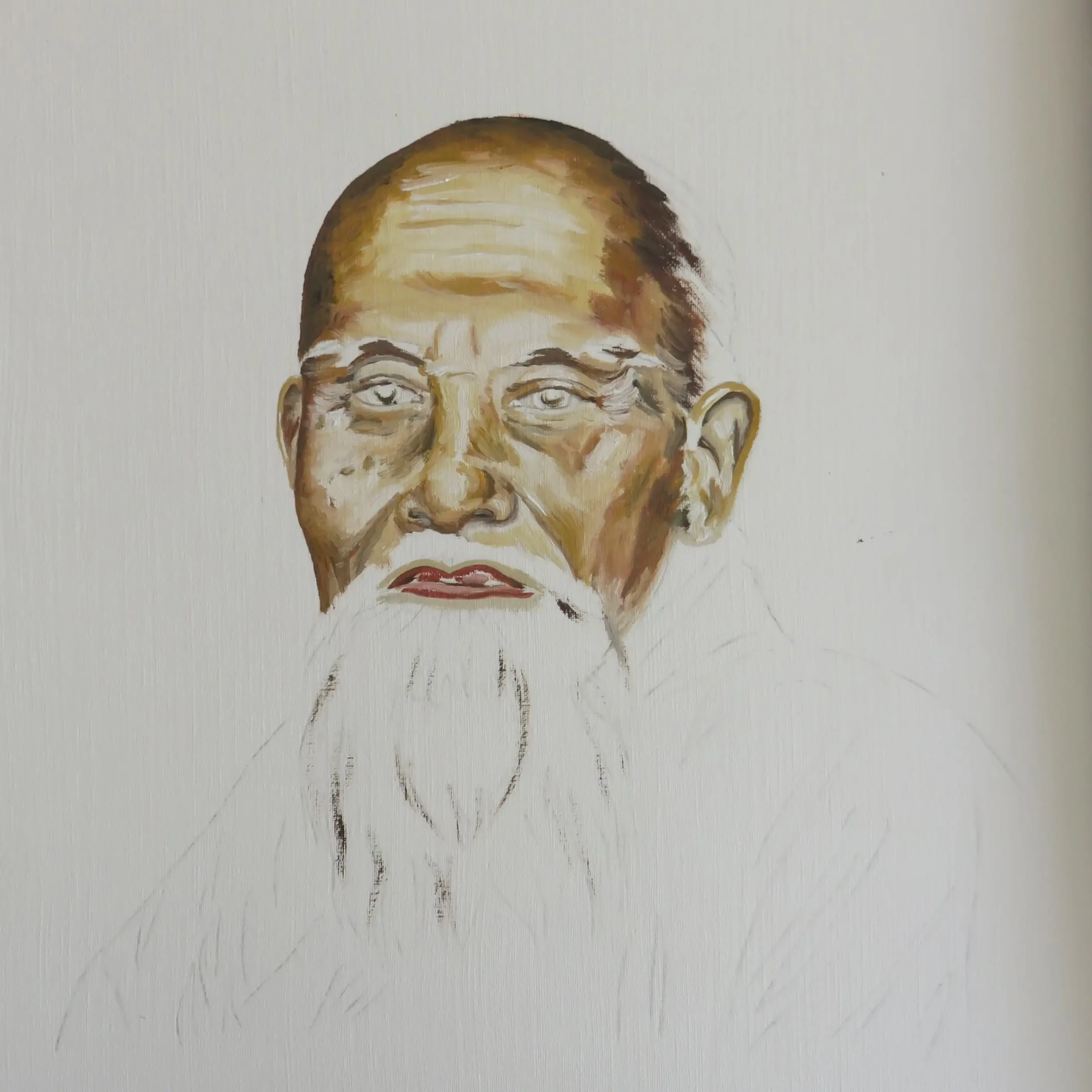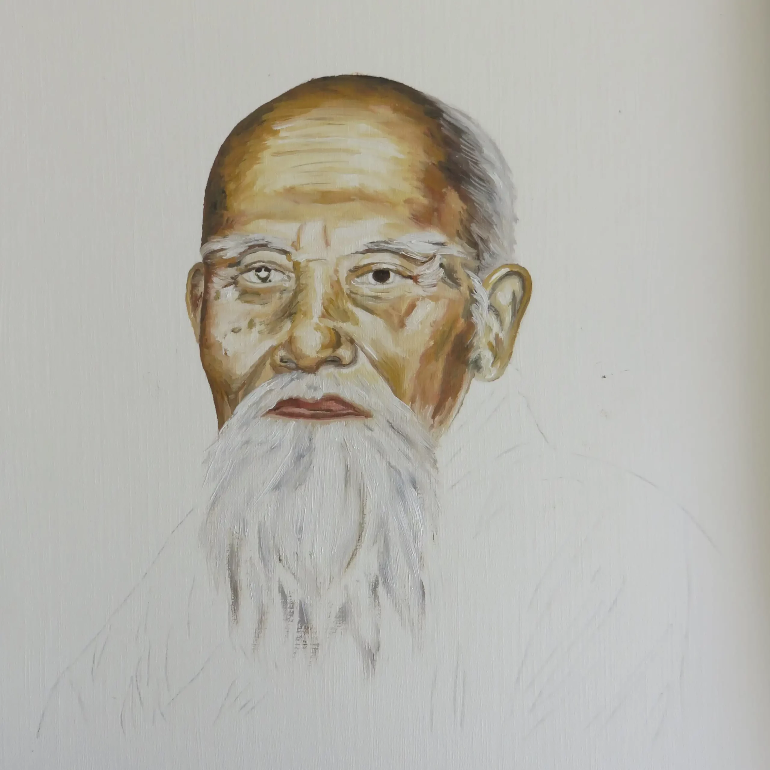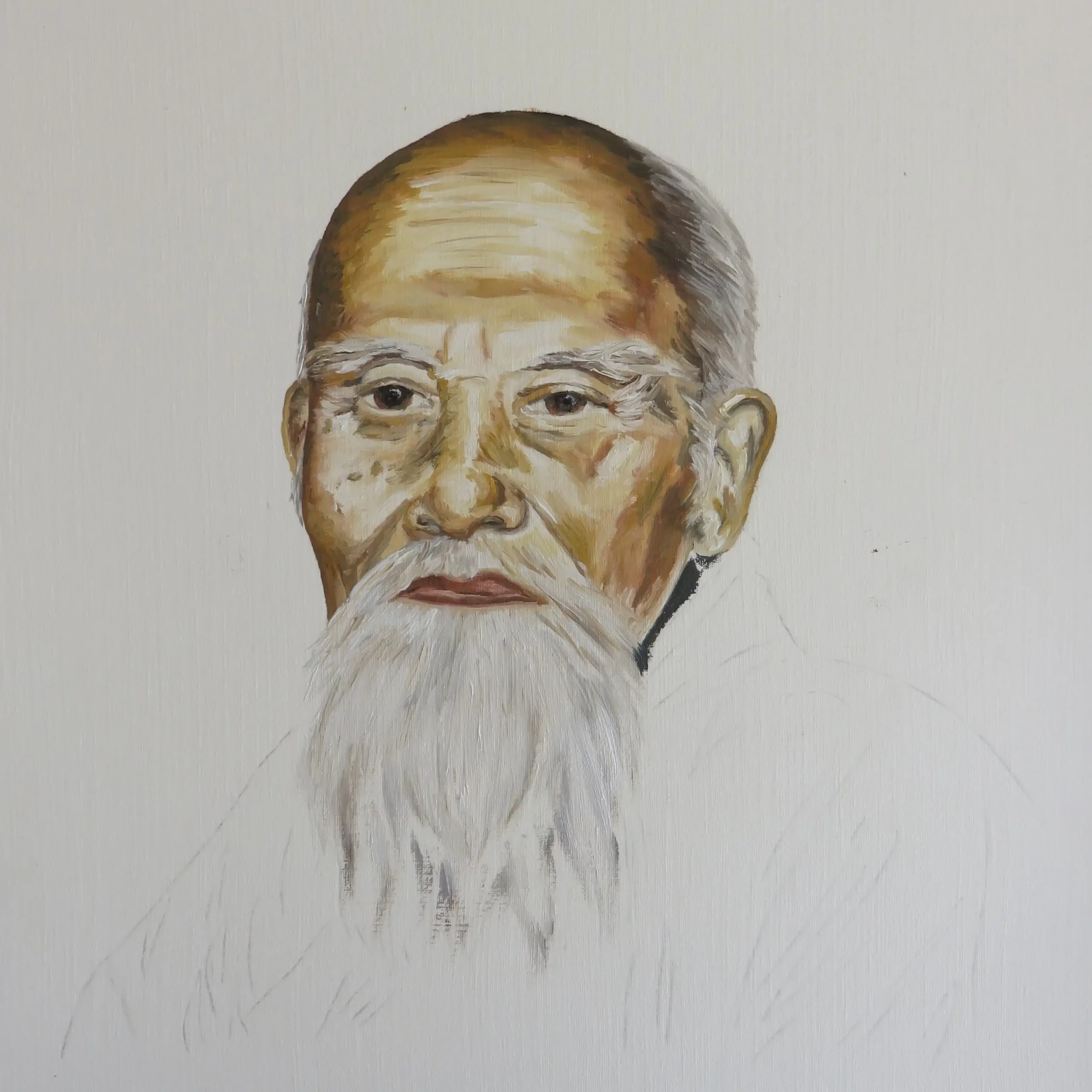 For this illustration, I searched long and hard for a photo of O-Sensei that I liked and that was of good enough quality for me to paint a sufficiently accurate portrait. There are many photos of Ueshiba, but they are old and often slightly blurred. This makes it difficult for me to paint the eyes, which are often just shadows.