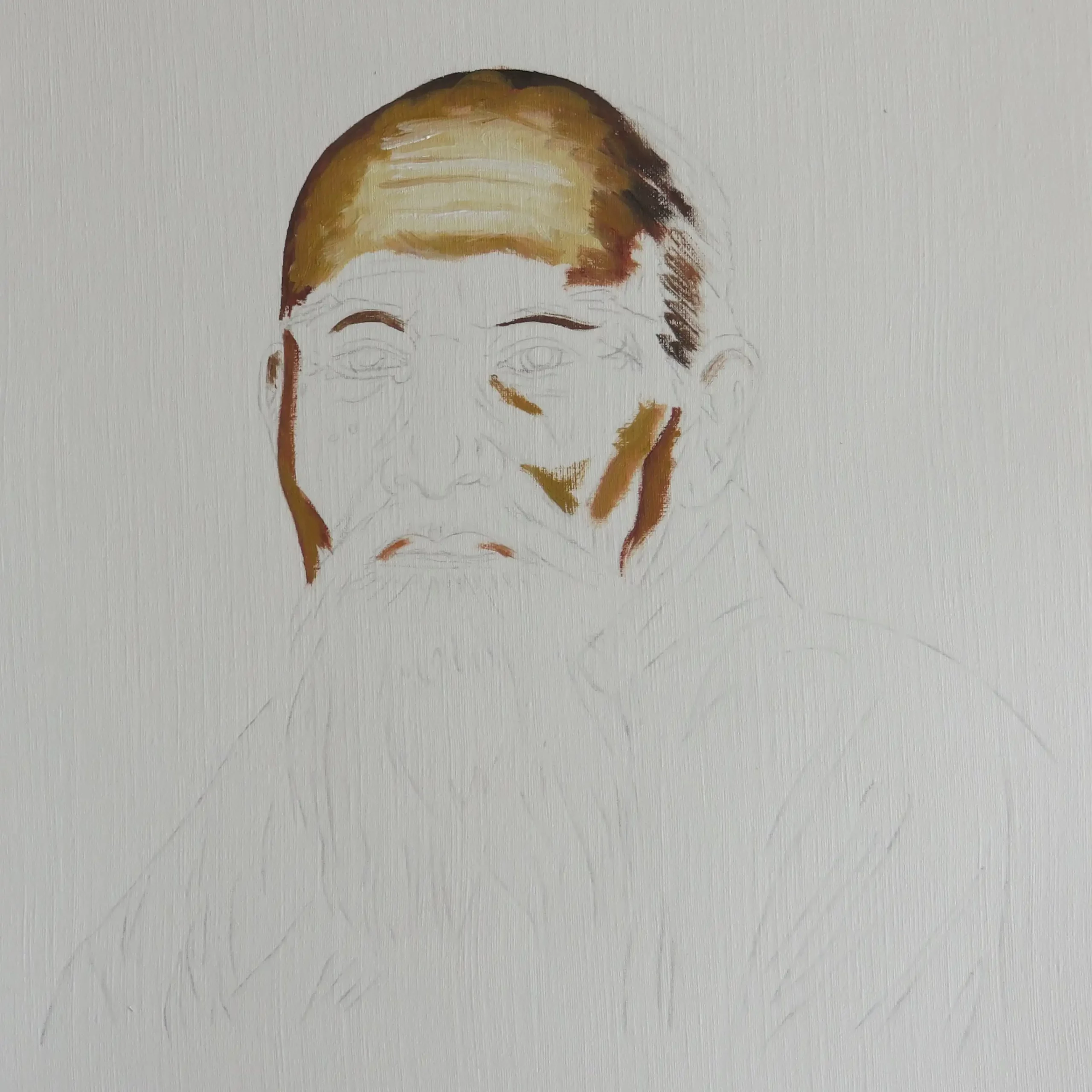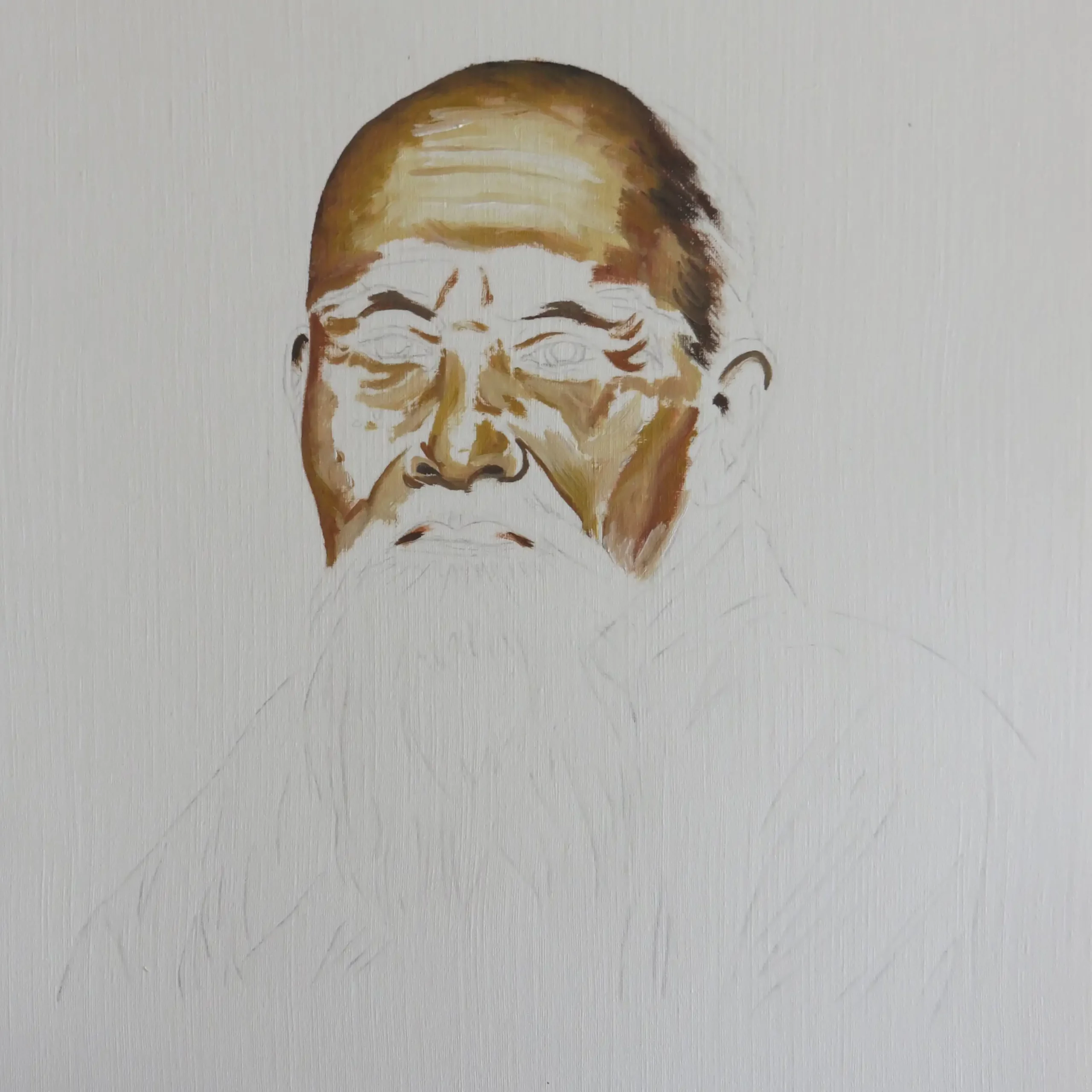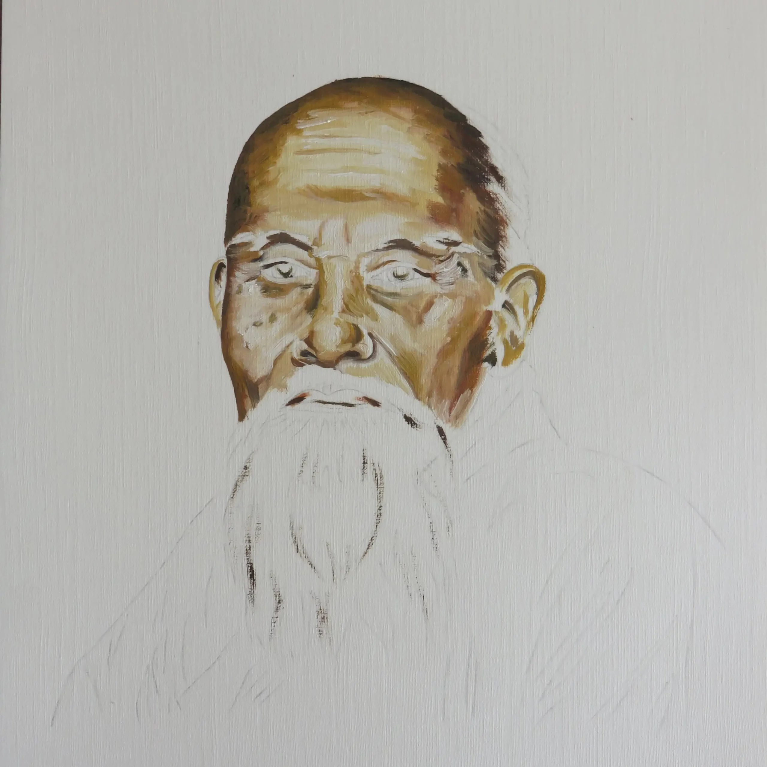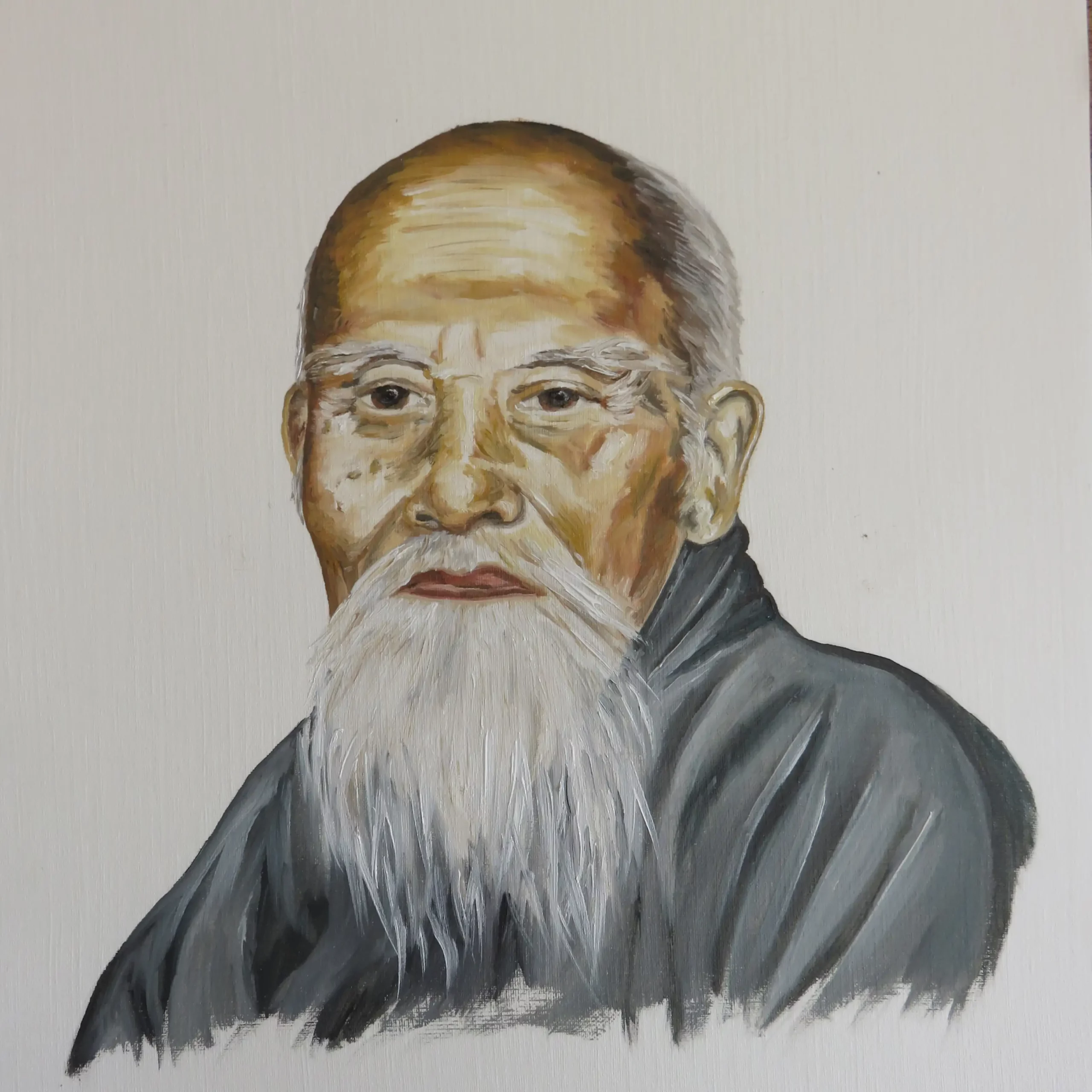 For this illustration, I searched long and hard for a photo of O-Sensei that I liked and that was of good enough quality for me to paint a sufficiently accurate portrait. There are many photos of Ueshiba, but they are old and often slightly blurred. This makes it difficult for me to paint the eyes, which are often just shadows.